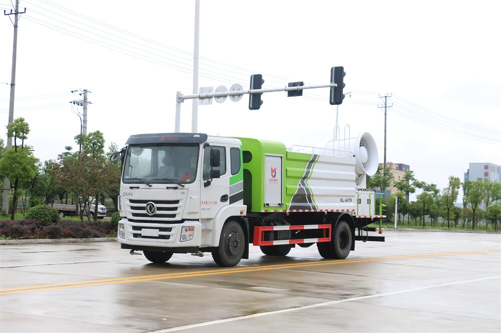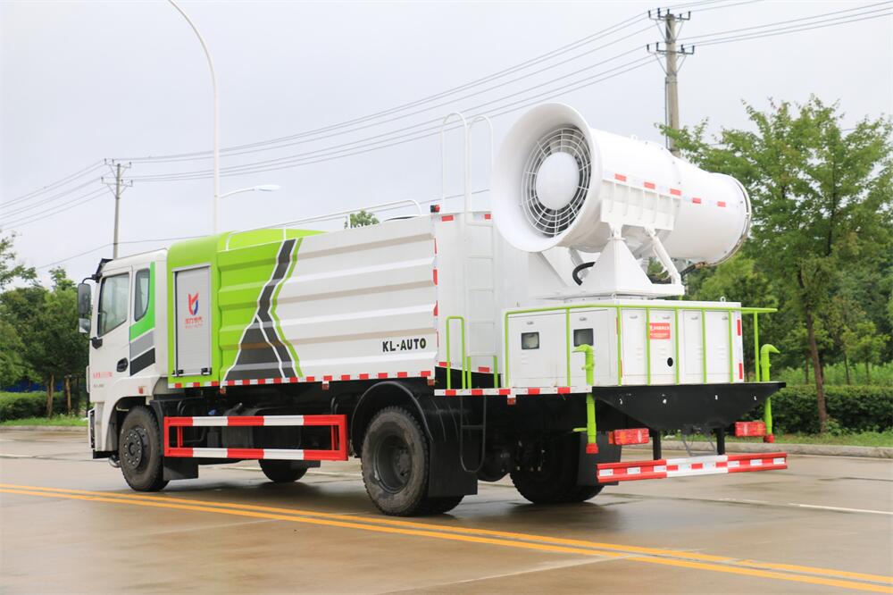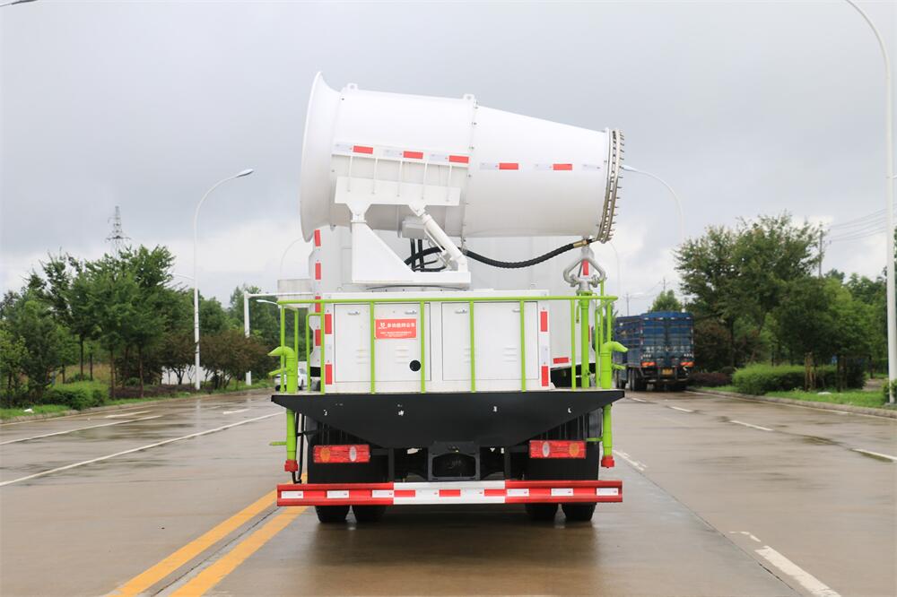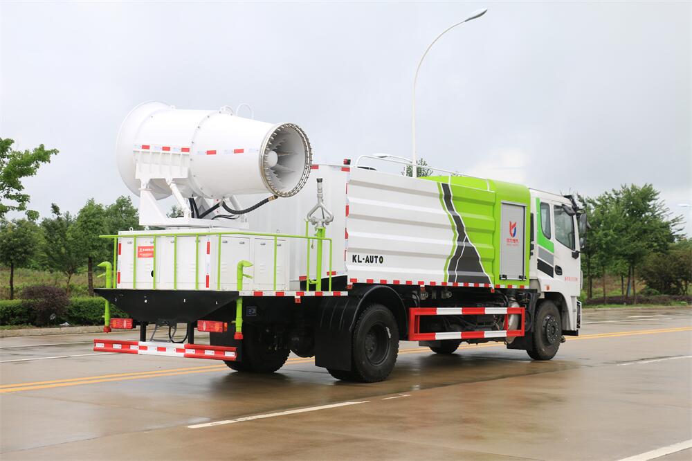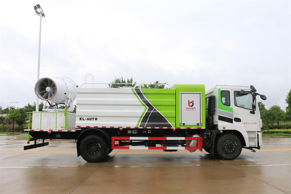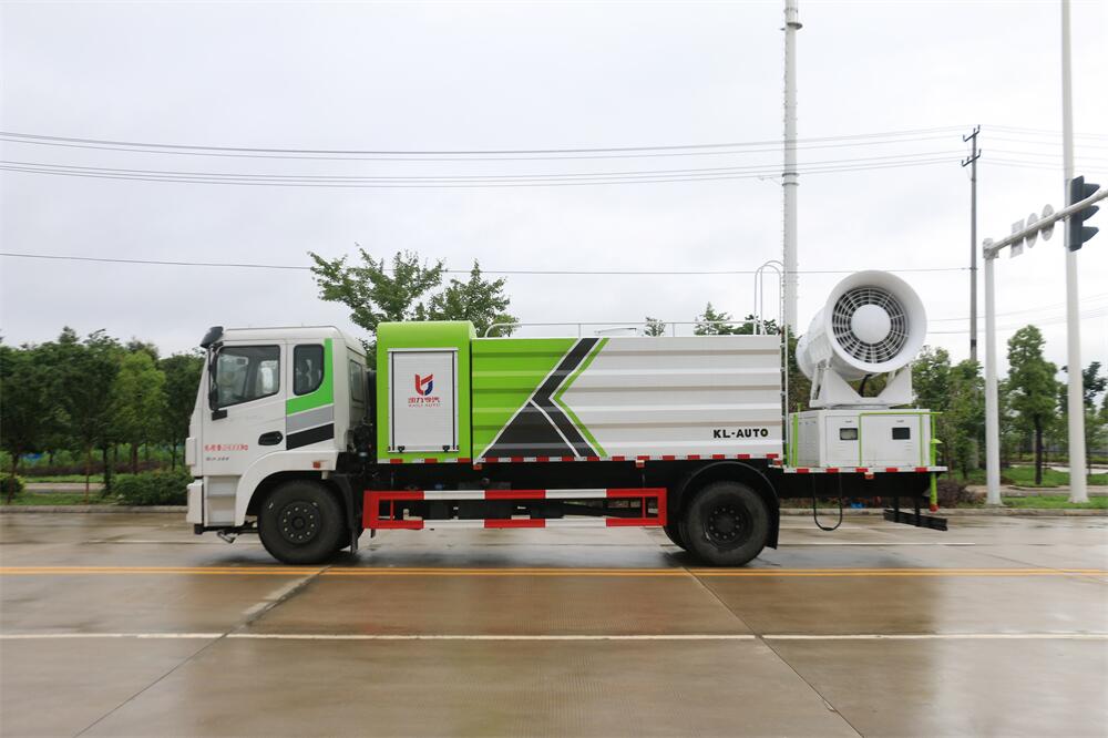上裝配置:罐體容積為 12立方,選配風送式霧炮機組射程30米、40米、50米、60米、80米、100米、120米霧炮,罐體鋼板為4mm碳鋼Q235材質,罐內隔板具有防波作用,以減輕汽車行駛時罐體液體沖擊,罐體及整車外形尺寸按照公告。帶大功率專用灑水泵,泵可自吸自排,整車前沖、后灑、側噴、帶65消防接口,后平臺配CLW-50、CLW-60、CLW-80、CLW-100、CLW-120型風送式霧炮機組;罐體前封頭配大功率柴油發電機組;前封頭帶水位計,后平臺主管路帶1寸澆花接口,后爬梯。帶兩根輸水管及陰陽端。罐體顏色:銀/灰/綠,罐體兩側噴“多功能抑塵車”字樣,貼反光標示。